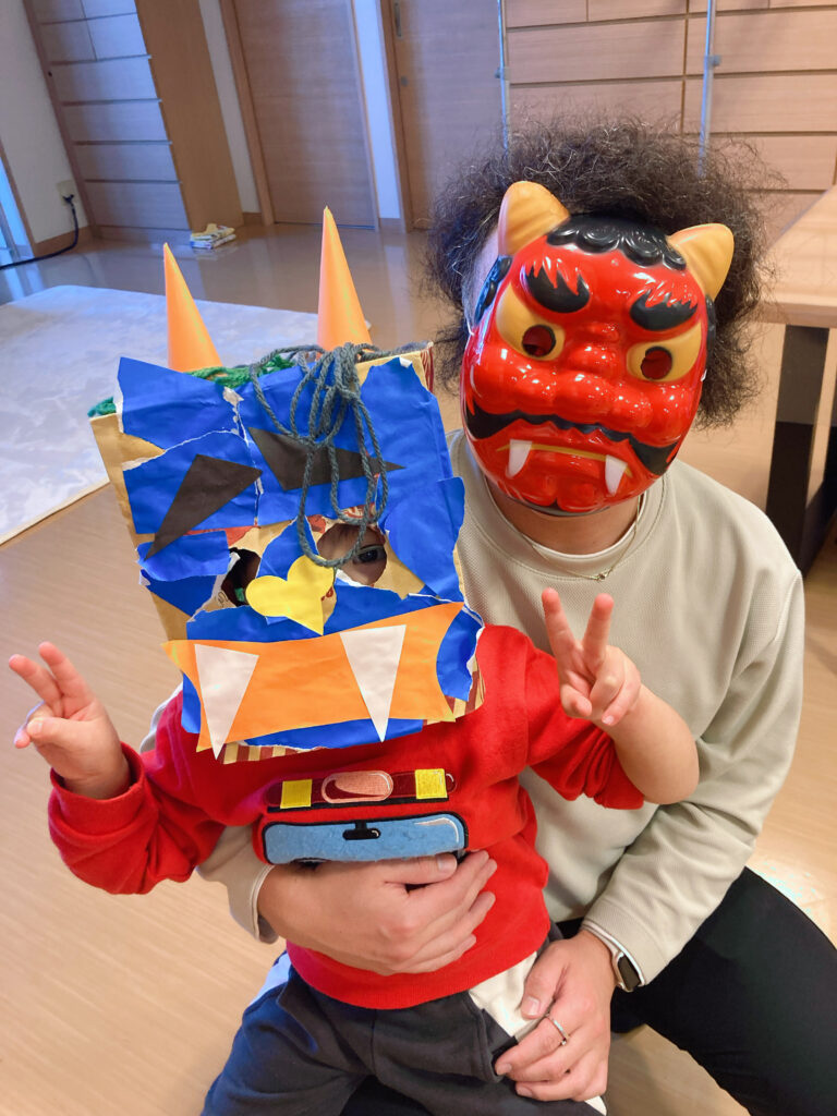 幼児さんの中には泣いてしまう子もいましたが、最後にはこども園で作った仮面をかぶって鬼と一緒に写真を撮っていました。