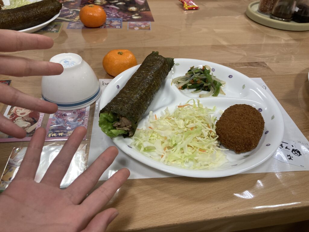 夕食は調理員の手作り恵方巻を南南東の方角を見て食べました。